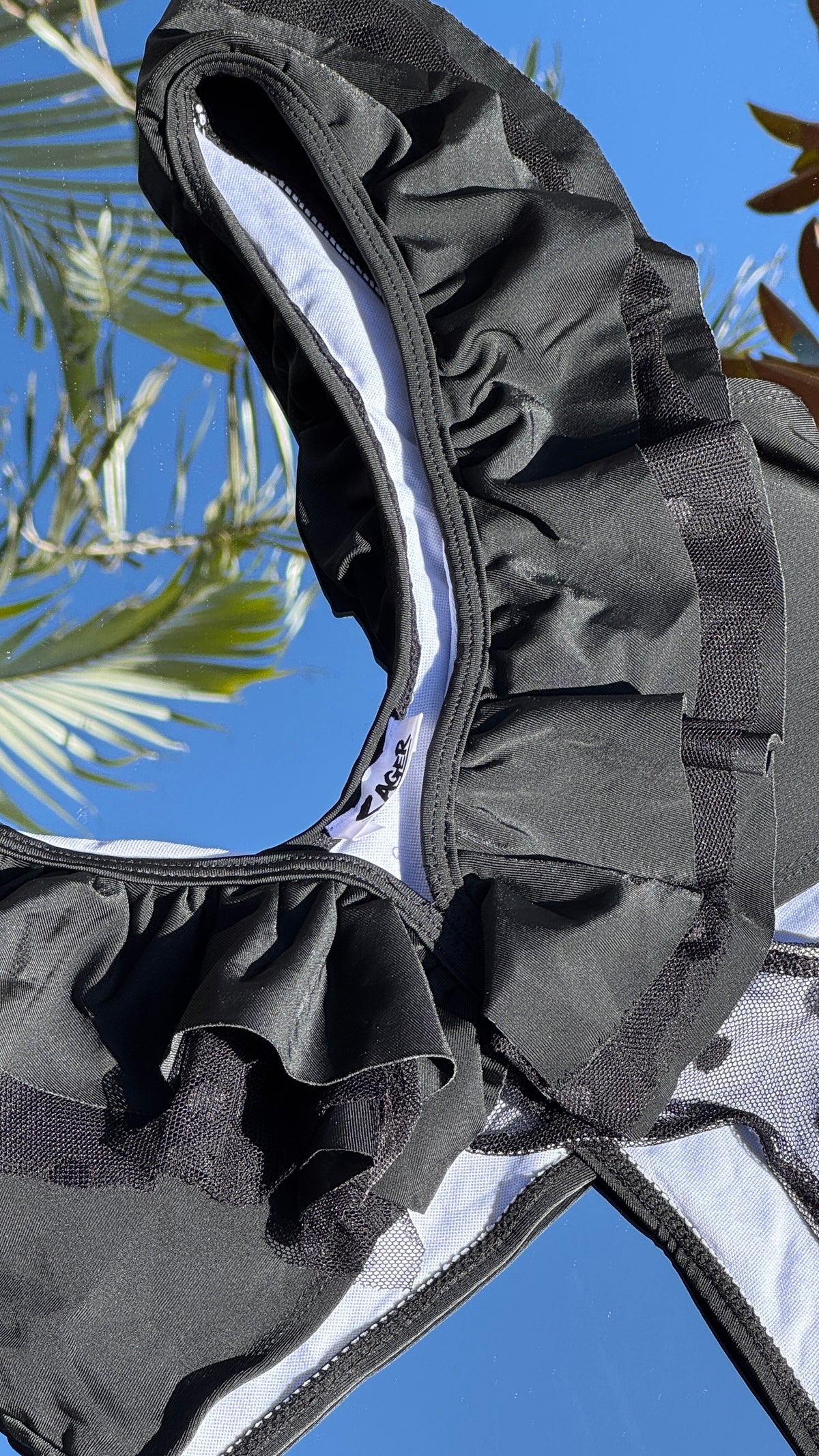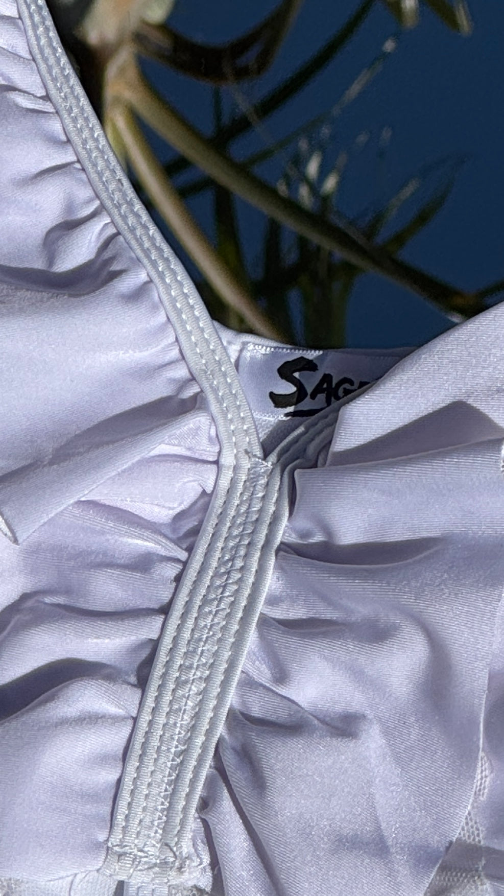 Top: V-neckline with a romantic double ruffle design across the shoulders and chest. No back closure or adjustable straps. Features removable cups for comfort and natural shape.
