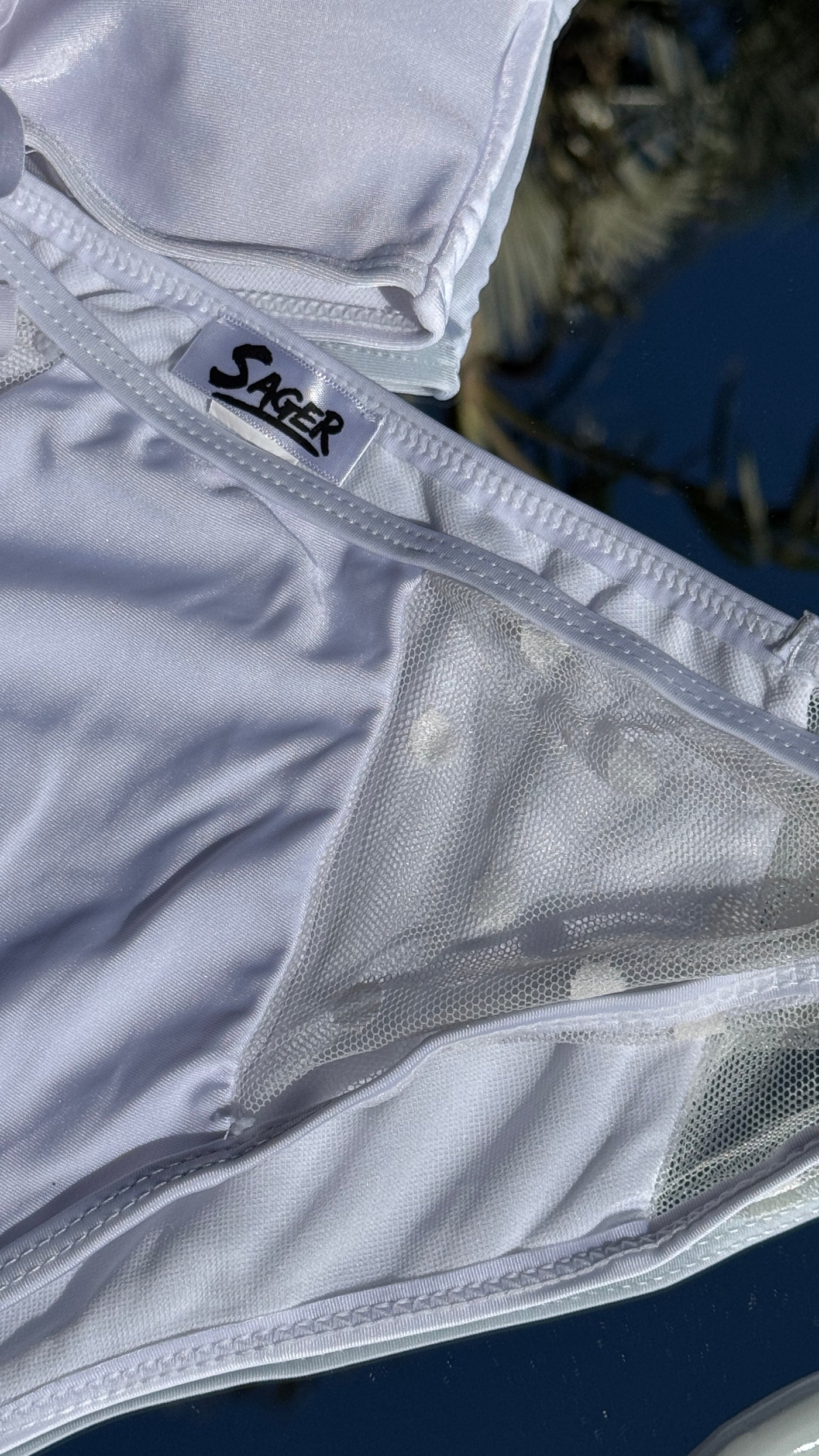 Bottom: High-waisted bikini cut with sheer polka dot mesh panels on the sides, adding a feminine, vintage touch.