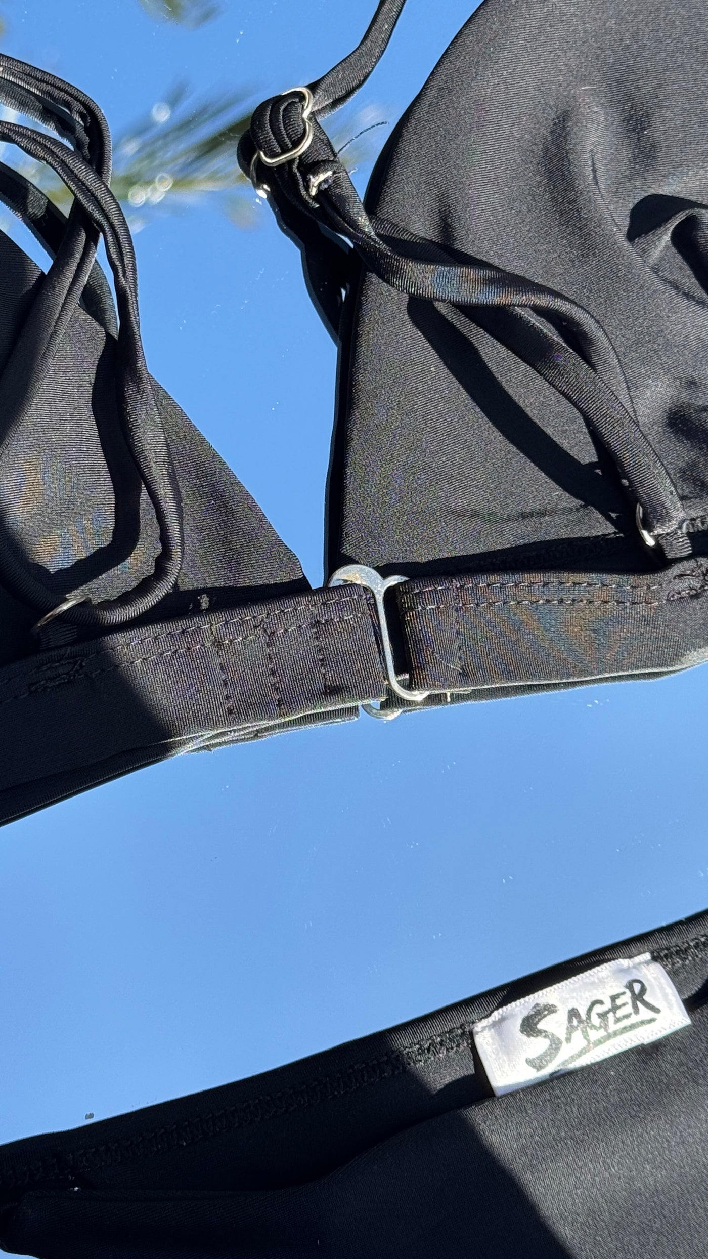 Top: Triangle cut with a deep V-neckline. Fixed (non-removable) cups for natural shaping and added support. Features thin adjustable straps and a three-position hook closure at the back for a customizable fit.